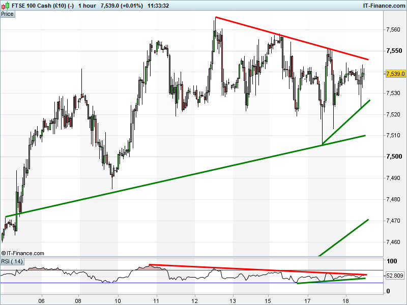 The UK Index 100 remains around the 7545 upper bounds of its narrowing pattern. Long lower tails of late are bullish. RSI suggests index close to a break higher or lower
