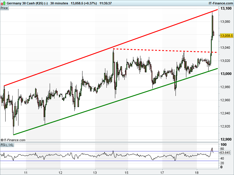 The DAX 30 has broken out to fresh highs >13040. Rising channel extended.