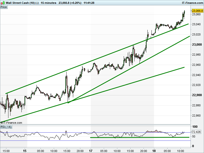 Dow Jones Futures trade fresh record highs 23065. Uptrend accelerated. Resistance turned support. RSI in upper half remains bullish