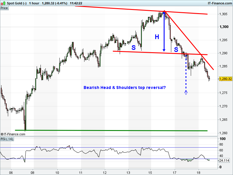 The UK Index 100 remains around the 7545 upper bounds of its narrowing pattern. The DAX 30 has broken out to fresh highs above 13040. Dow Jones Futures trade fresh record highs 23065. Gold continues its bearish H&S top reversal back towards $1275.