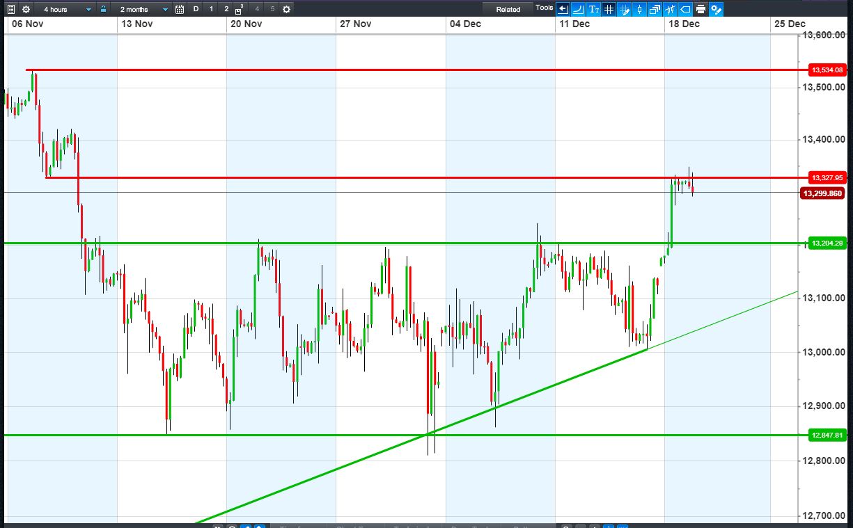 The DAX 30 has found resistance at 13325 after yesterday’s 13200 breakout. Bullish flag?