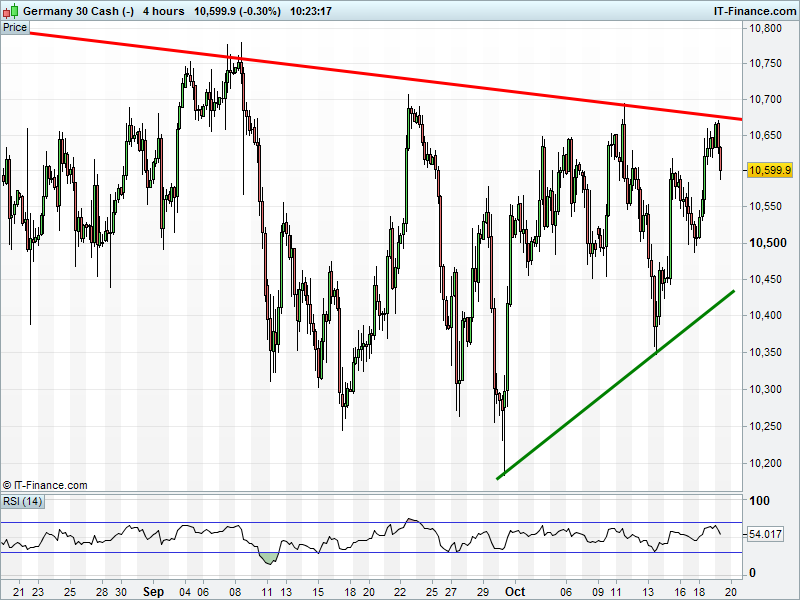 The DAX 30 has sold back from 2-month shallow falling highs ceiling at 10650. Back to its floor of rising lows via a bearish rising wedge? Or will 1-week rising lows maintain the uptrend?