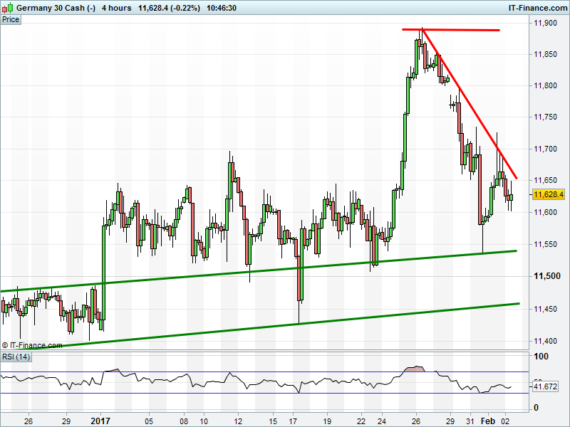 The DAX 30 remains trapped behind falling highs at 11650.