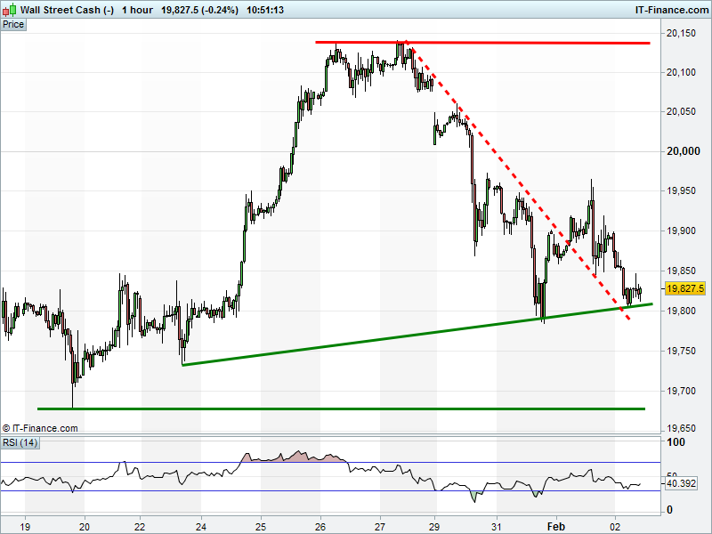 Dow Jones Futures have broken beyond falling highs resistance and look to have found shallow rising support at 19800. Bounce or breach?
