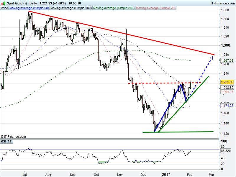Gold is testing $1220 which could open the door to a bullish flag to $1280.