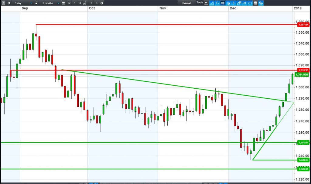 The UK Index 100 has pulled back to support at 7645. The DAX 30 has bounced off 12745. Dow Jones Futures are back in the middle of their 24700-24900 range. Gold is close to challenging late Sept highs of $1315.