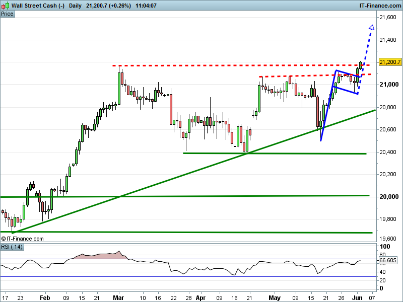 Dow Jones Futures are in the midst of a bullish flag which, if completed, could take the index above 21,500.