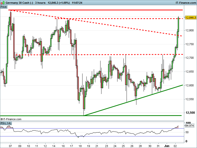 The DAX 30 is testing resistance at 12845 and out-of-hours all-time highs of 12875.