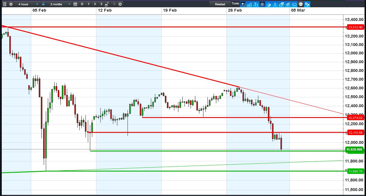 The DAX 30 has re-tested 9 Feb lows of 11910.