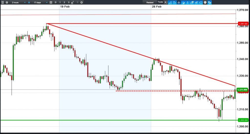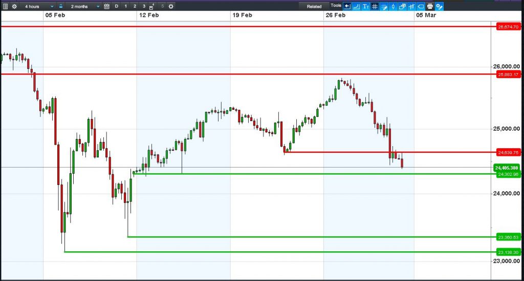 The UK Index 100 has found support at overnight lows of 7100. The DAX 30 has re-tested 9 Feb lows of 11910. Dow Jones Futures are testing for a breach of 24400. Gold is trying for a breakout at $1324.