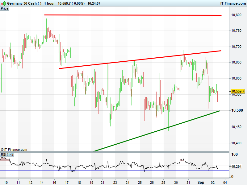 The DAX 30 is in a shallow rising channel with support at 10500. Resistance at 10580?
