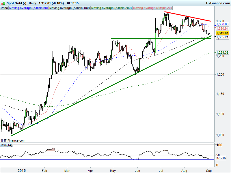 The UK 100‘s overnight bounce from 6720 is getting a second wind. Bullish flag to 6810 channel ceiling? The DAX 30 is in a shallow rising channel with support at 10500. Dow Jones futures have rallied back close to test the ceiling of their 3-week falling channel at 18435. Gold has managed to hold its 2016 uptrend with support via its 100-day MA at $1305. Is the 3-week downtrend finished with though?