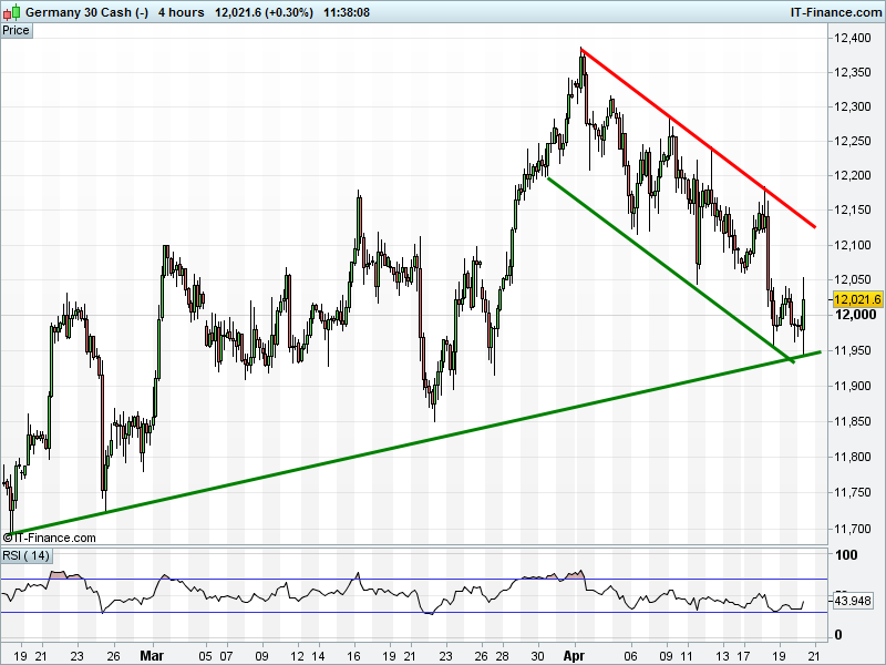 The DAX 30 has found 2-month rising support at 11950 and regained 12000. Back to channel ceiling at 12100 or will 12050 prove a hurdle?