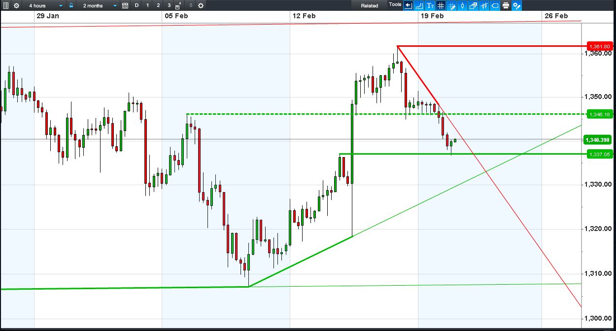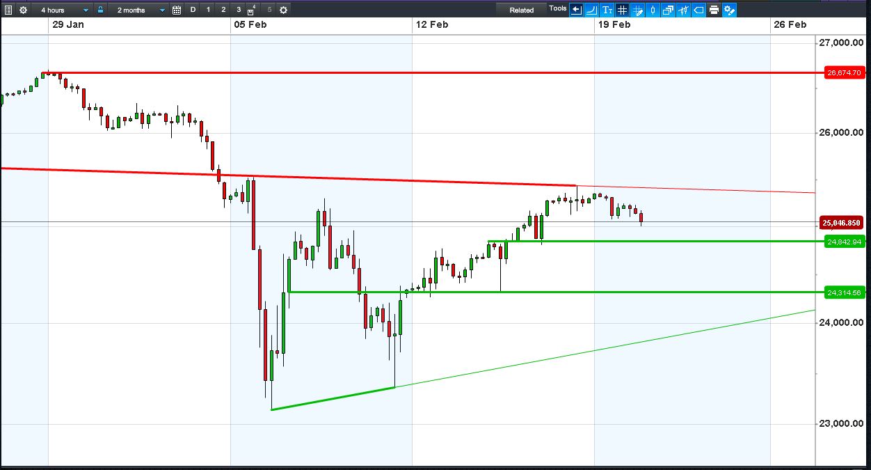 The UK Index 100 has bounced off Thursday’s 7205 lows. The DAX 30 has bounced off Feb rising support at 12335. Dow Jones Futures have rolled back to test 25000. Gold has broken below $1346, disliking the strong USD.