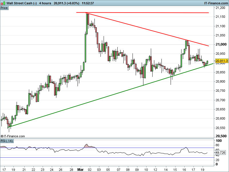 Dow Jones Futures are bouncing from 20880 lows after falling overnight. Could a breakout from 21000 ceiling confirm a bullish pennant pattern?
