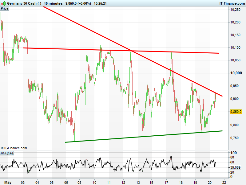 The DAX remains hindered by a 1-month trendline of falling highs at 9900. which has served to cap the index’s overnight reversal. Into another apex?