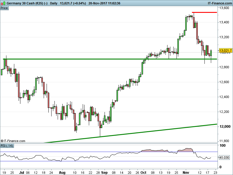 European equities are in recovery mode having initially opened lower after German coalition talks fell through late last night. Both the UK’s UK Index and the German DAX have bounced from session lows as investors digest not only what the future of the German government will end up looking like (first ever election re-run needed or a Merkel-led minority government?), but also how the collapse of negotiations in Berlin will affect those continuing in Brussels between the UK and the EU. The German President is expected to make an announcement at 1:30pm GMT. Meanwhile, US investors continue to digest to probability of US tax reforms being passed before year-end, needing Republican senators to overcome a multitude of hurdles to make their two seat majority count.