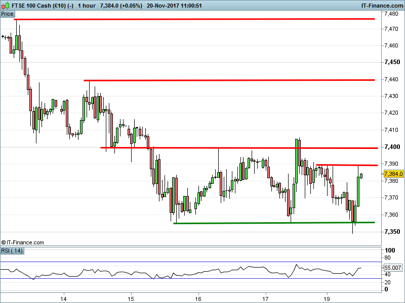 The UK Index 100 has bounced from lows of 7350 to test Friday afternoon’s 7390 highs.