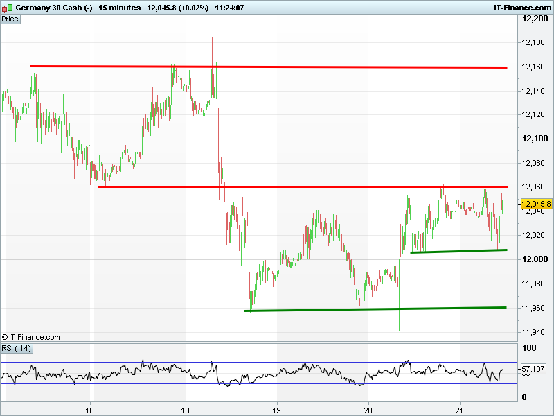 The DAX 30 remains in a narrow 12010-12060 sideways channel. Which way will it break?