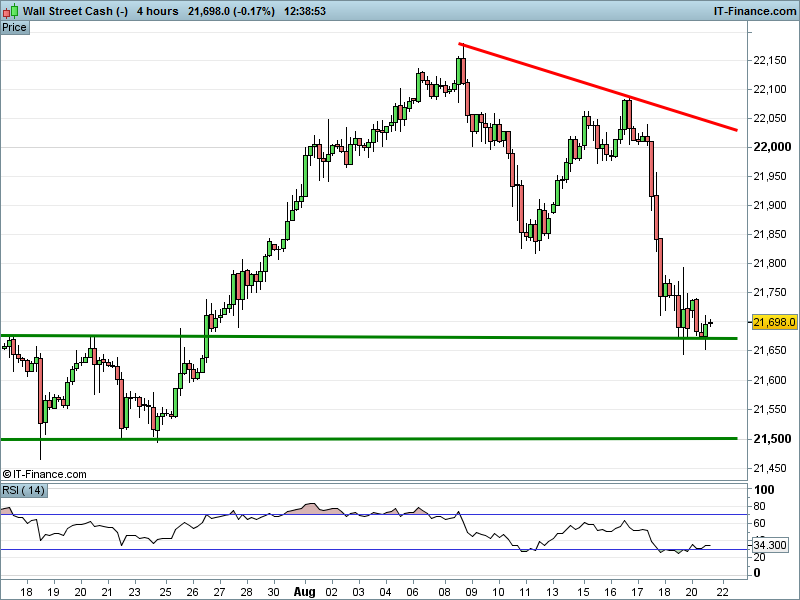 The UK Index 100 is falling from resistance at 7335 having survived an early test of 3-month 7300 support.