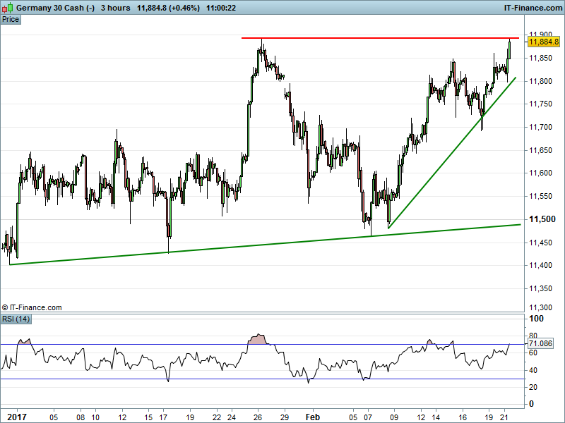 The DAX 30 is around 10 points away from reaching a fresh 22-month high of 11890.