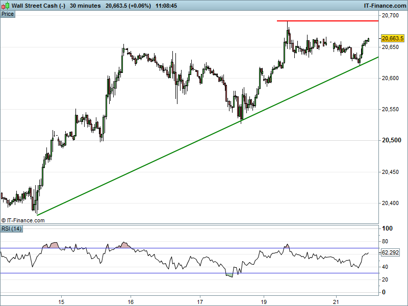 Dow Jones Futures are pointing towards an open at intra-day all-time highs after bouncing from 20620 rising lows support, having fallen back from yesterday’s mornings highs of 20690.