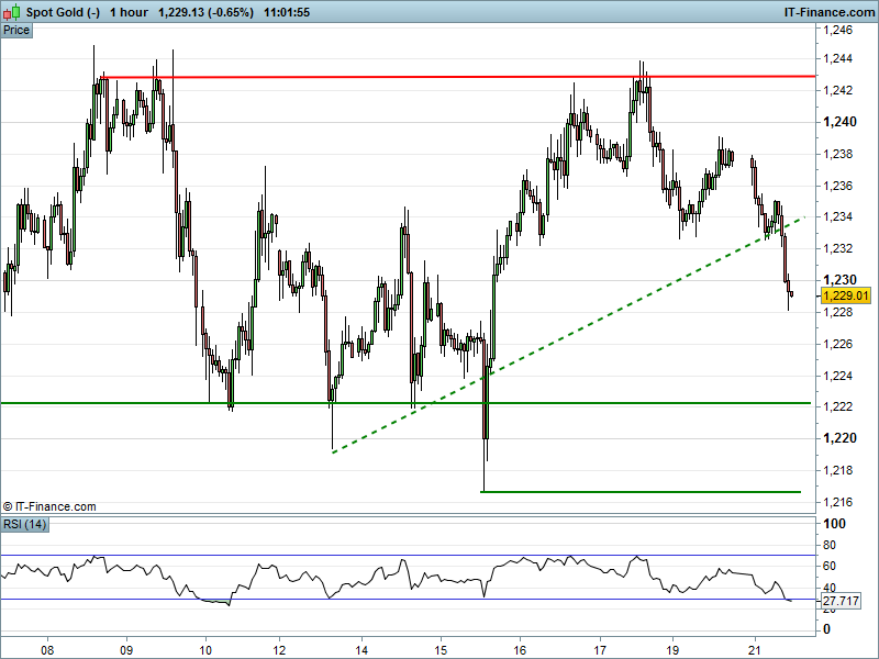 Gold has broken down from 2-week rising lows support of $1234 as the stronger USD hampers safe haven demand.