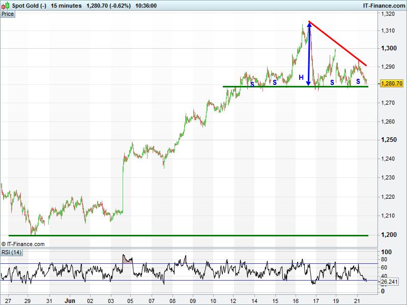 Gold may be in the late stages of forming a pair of bearish patterns (complex head and shoudlers top reversal; descending triangle) a breach of $1280 being the trigger for drops of at least $35.