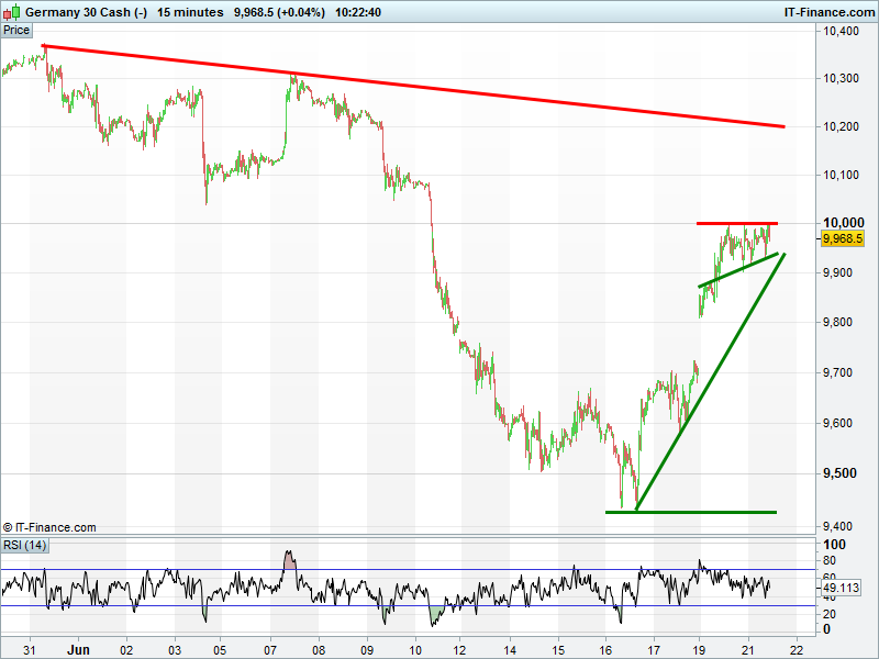 The DAX30 is sitting just below 10000, awaiting a driver for a breakout. Bullish ascending triangle?