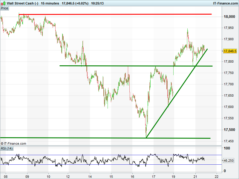Wall Street/Dow Jones futures remain in an uptrend from Thursday’s lows, holding 17850 thanks to a trendline of rising support.