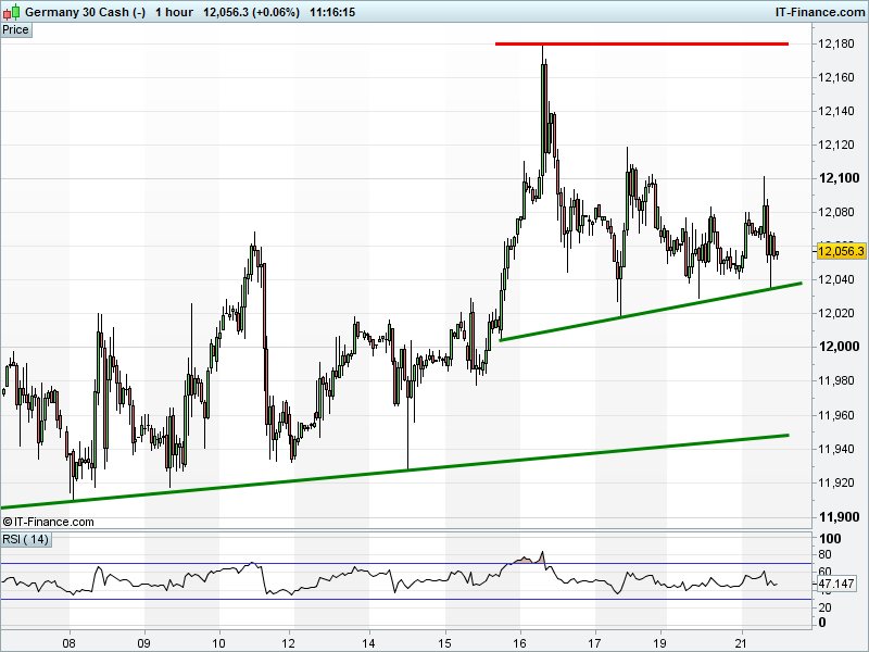 The DAX 30 is holding shallow rising support at 12040.