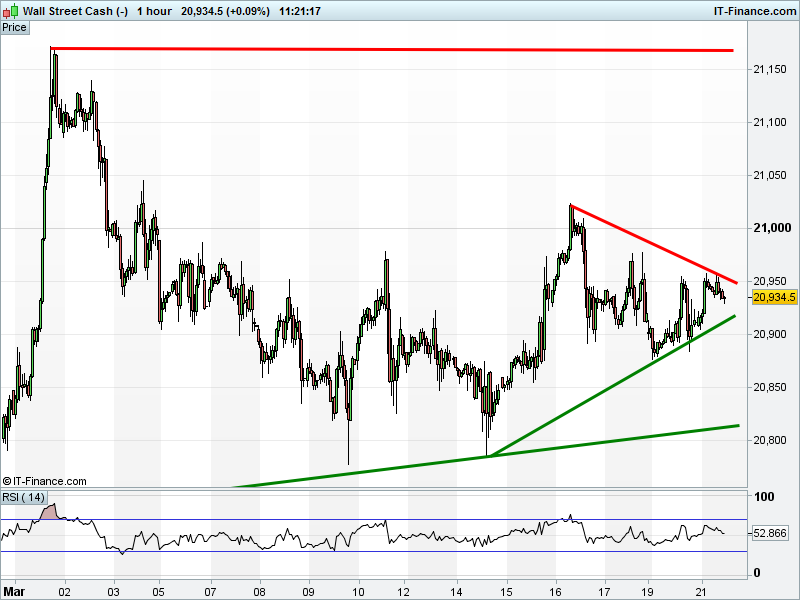 Dow Jones Futures are at the 20930 apex of a bullish pennant a break out from which could take it back towards 21150.