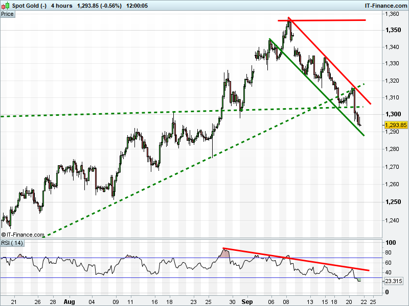 The UK Index 100 is sideways at 7275, penned between rising support and falling resistance. The DAX 30 is holding above 12600 in a bullish pattern towards 12900. Dow Jones Futures above 22400, remain in their uptrend, another fresh high yesterday. Gold has broken below $1300, extending its September down-channel .