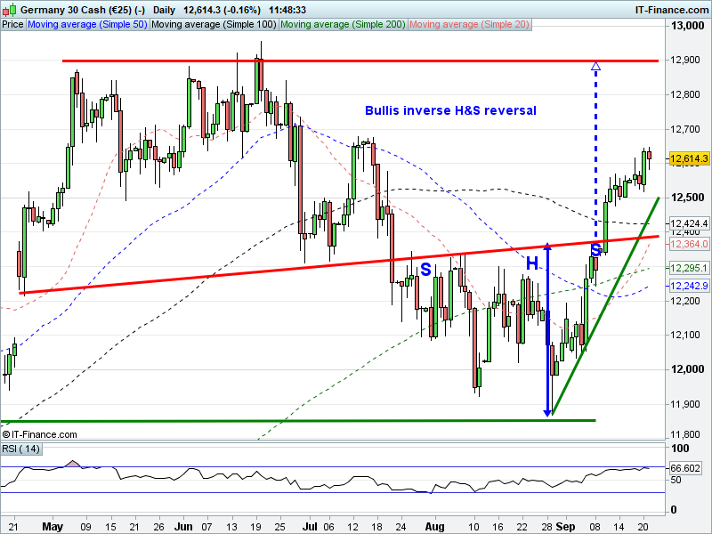 The DAX 30 is holding above 12600 in a bullish head & shoulders reversal pattern back towards 12900.