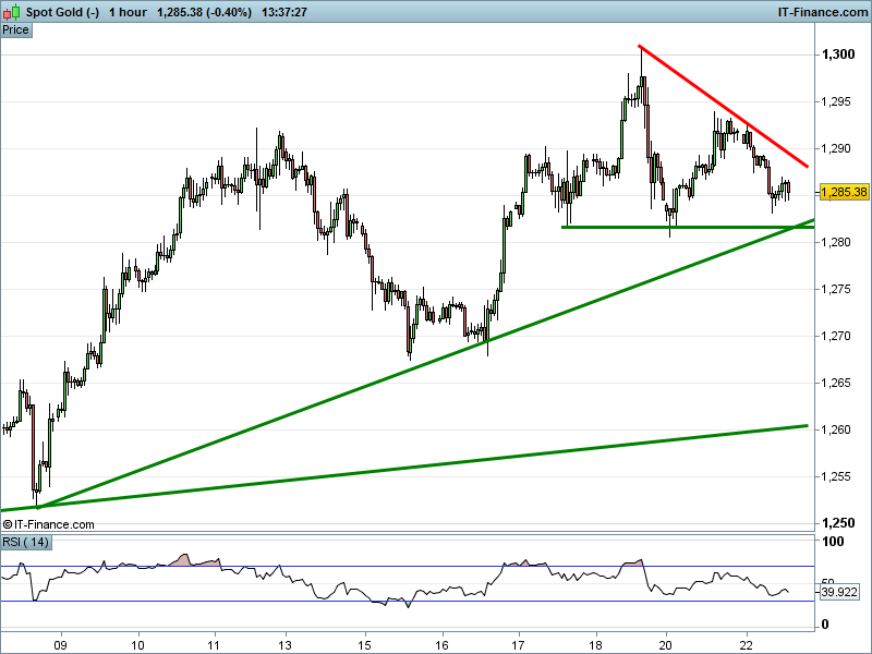 The UK Index 100 is challenging 2-week falling highs resistance at 7385. The DAX 30 has extended its bounce from 12020 support. Dow Jones Futures are mounting a second attempt on intersecting resistance at 21795. Gold is suffering from the USD strength, extending its fall from Friday’s foray above $1300.
