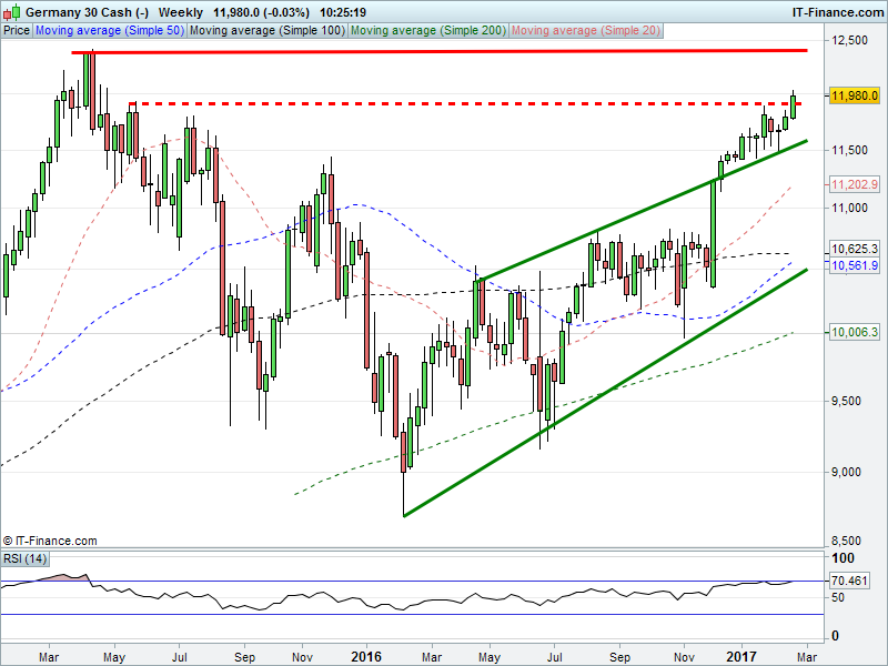 The DAX 30 is making a bullish test of 11200, trading around 22-month highs. Can it rally on to test 12400 all-time highs?