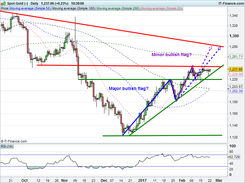 Gold has bounced from $1226 to keep intact its Feb uptrend. But can it break above $1244 to allow extension of major bullish flags?