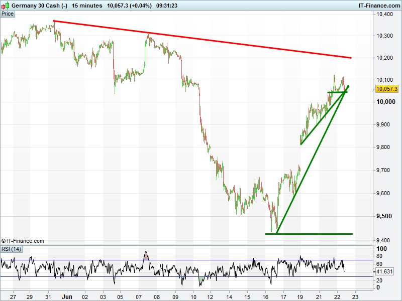 The DAX30 has turned back from 10100 but is holding uptrends for this week and since last week via rising support at 10050. Beware the risk of a double-top back below 10000 should 10040 be breached.