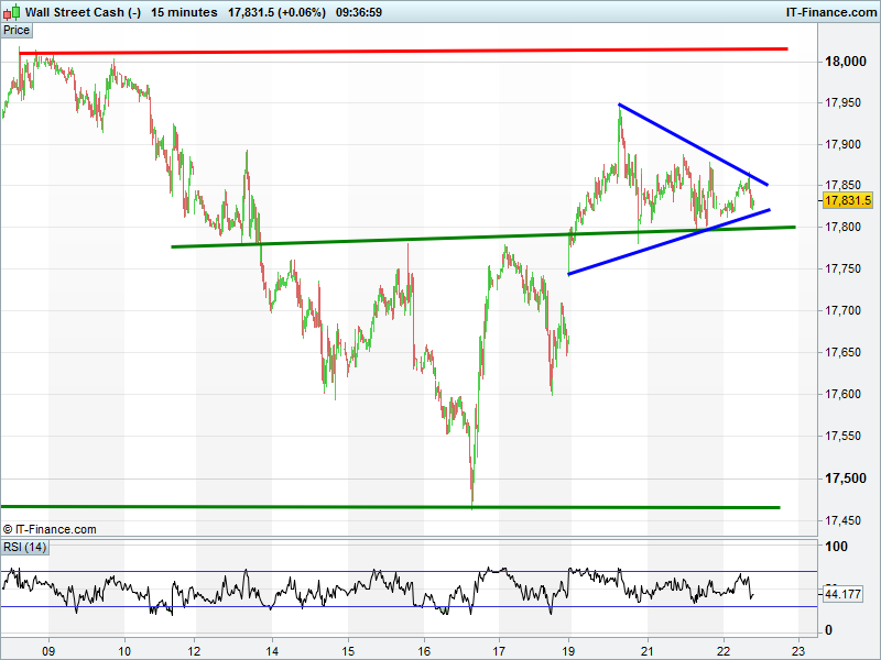 Wall Street/Dow Jones futures are sideways around 17850 into the apex of a narrowing consolidation pattern, a breakout from which tends to result in continuation of the trend into; in this case up. Beware any breach of 17800 support.