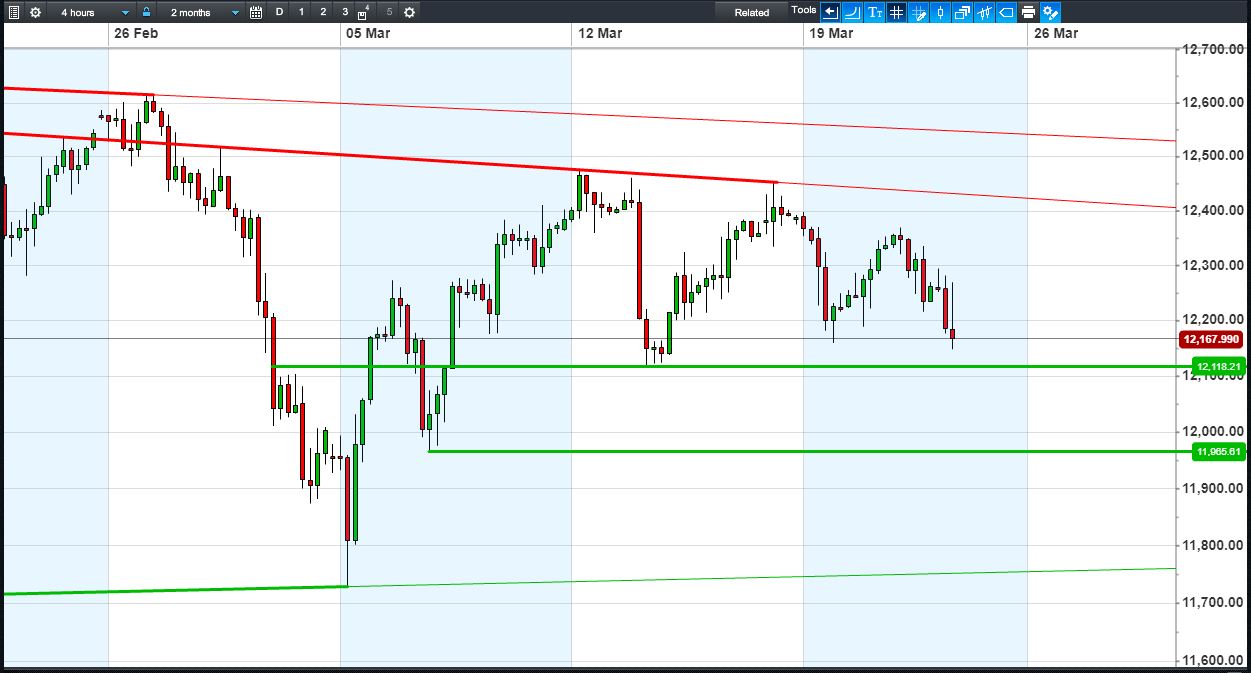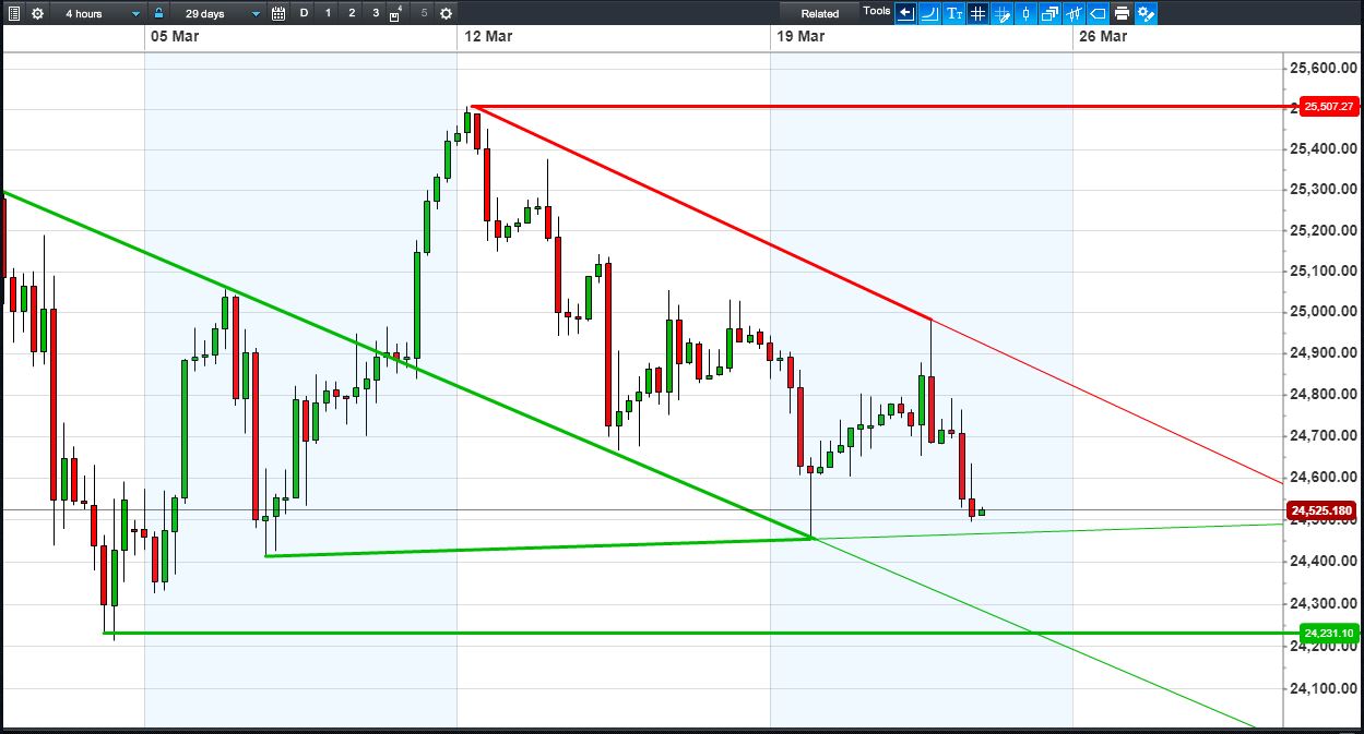 Equities are firmly in the red, reacting to the trio of mixed guidance from the Fed (short term unchanged, long-term steeper hiking), the threat of a global trade war (Trump to announce tariffs on Chinese imports) and disappointing European PMIs. The Bank of England has also struck a slightly more hawkish tone (2 voted for a hike), adding to GBP strength resulting from USD weakness, to remain a UK Index hindrance. However, it’s Germany’s DAX which underperforms, albeit only marginally, and despite EUR off highs.