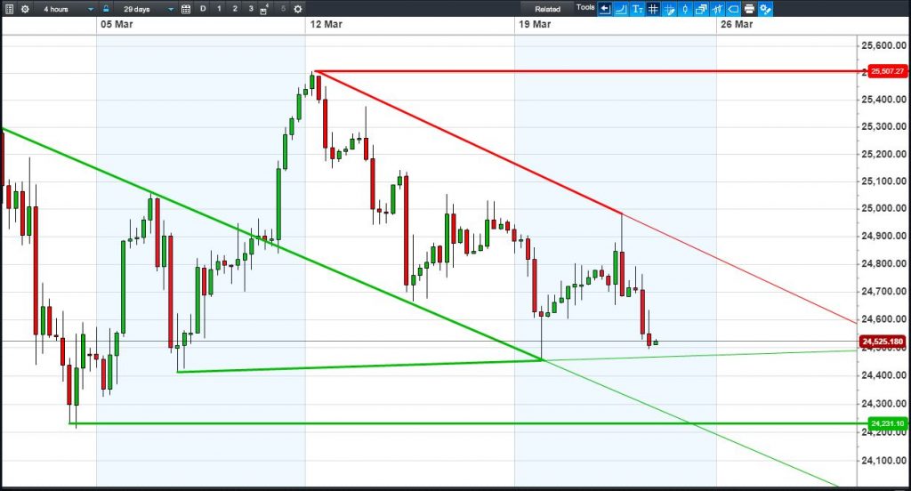 The UK Index 100 has breached twin support at 7000. The DAX 30 is edging back towards last week’s lows of 12120. Dow Jones Futures rolled over at 24800 to hold a falling channel. Gold’s breakout (on USD weakness) has been halted at $1336.