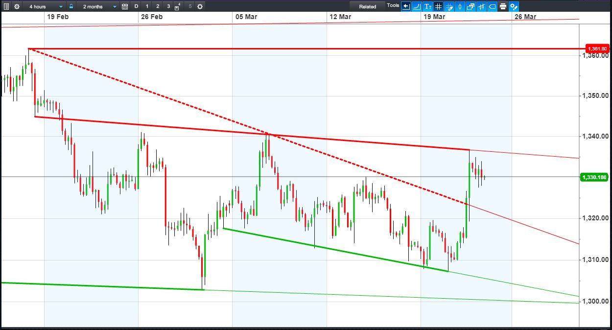 Gold breakout (on USD weakness) has been halted at $1336. Bullish flag pattern to north of $1340?