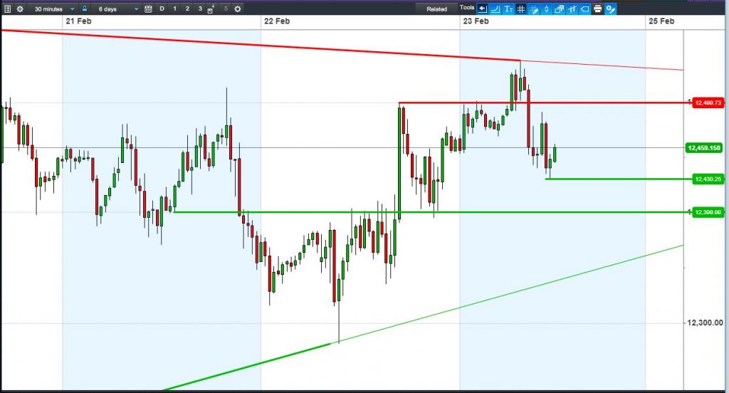 The DAX 30 trades off day lows at 12450, still in a Feb narrowing pattern