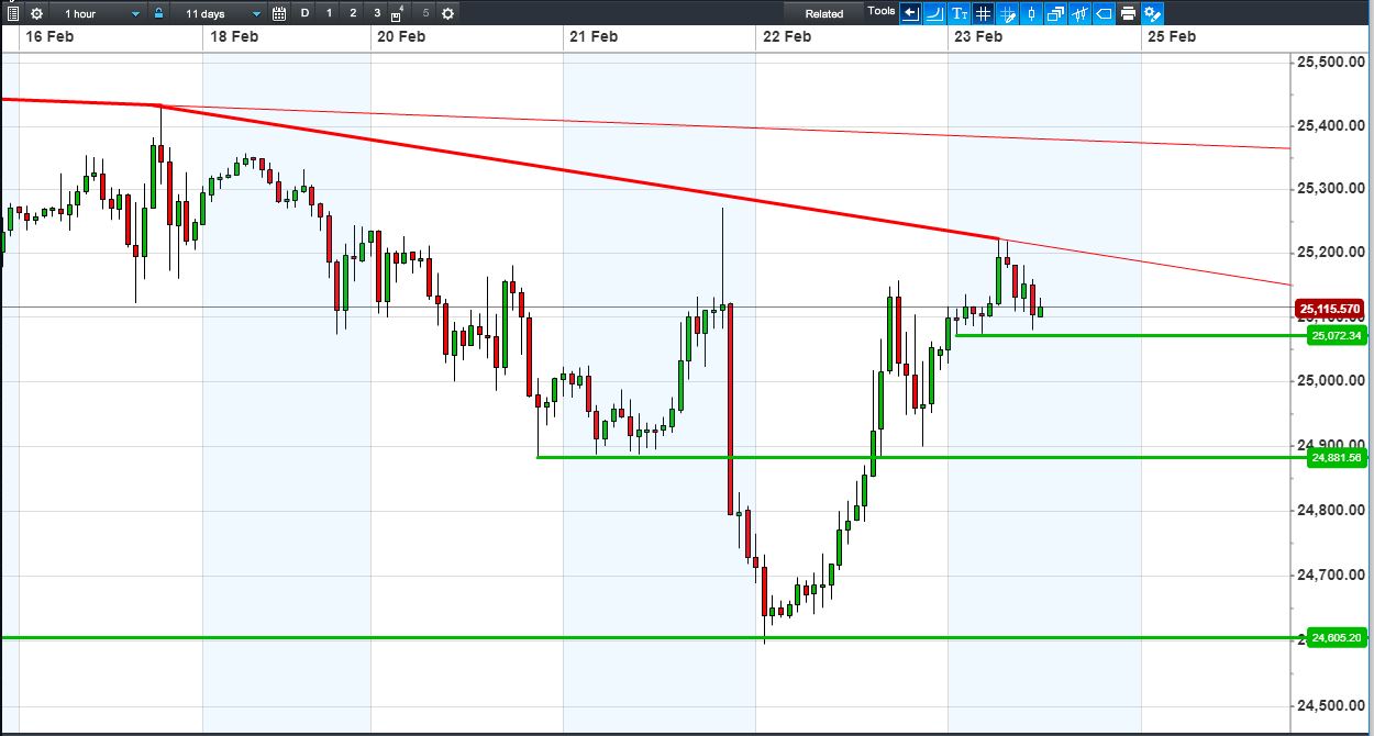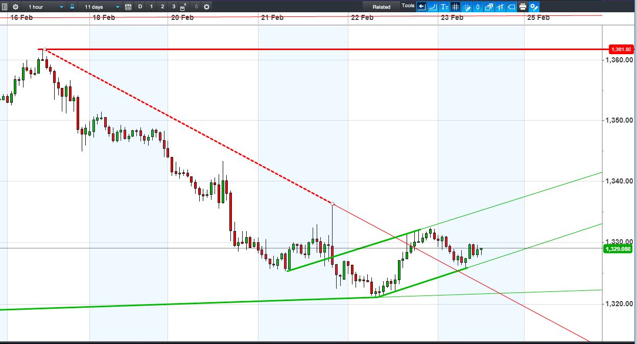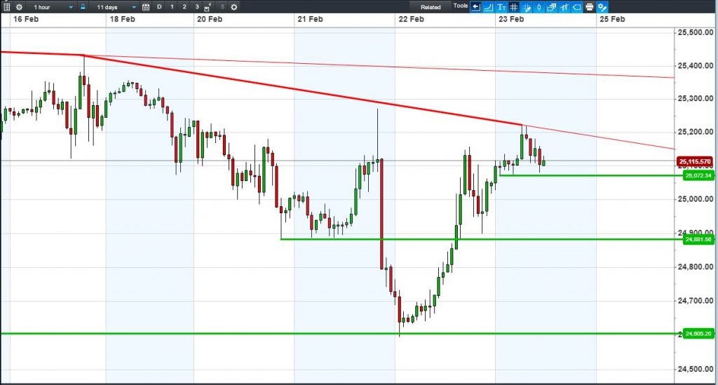 The UK Index 100 trades 7235, between overnight highs and lows. The DAX 30 trades off day lows at 12450, still in a Feb narrowing pattern. Dow Jones Futures still pressured by falling highs resistance at 25200. Gold’s bounce from $1326 confirms a new rising channel.