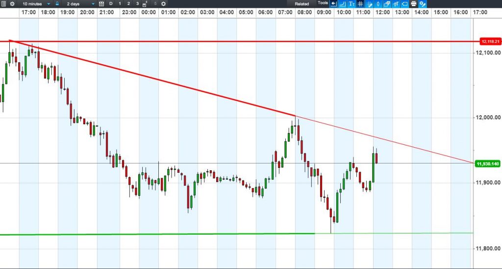 The DAX 30 has bounced back towards 12000 although needs to overcome falling highs.