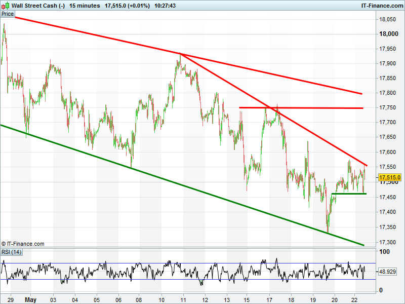 Dow Jones futures found support at 17460 this morning, but remains hindered by 10-May falling highs at 17550. Breakout to reignite bullishnes, or breakdown to resume bearishness?