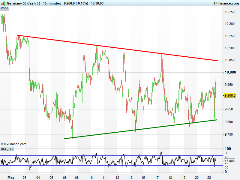 The DAX sits midway between 10050 falling highs and 9800 rising lows, yet to break the April downtrend and still sideways for May. A revisit of 10,000 could turn the tide more bullish.