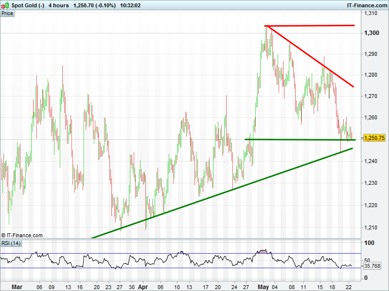 The UK 100 sits in a megaphone pattern which the bulls hope yields a breakout to continue the prior uptrend and complete the last section of the ‘in-progress’ bullish inverse head & shoulders at 6185. The DAX30 sits midway between narrowing 10050 falling highs and 9800 rising lows. Wall Street/Dow Jones futures found support at 17460 this morning but remains hindered by 10-May falling highs at 17550. Gold still holding 3-month rising support at $1250 with the strong USD still a hindrance, stifling any safe haven seeking demand.