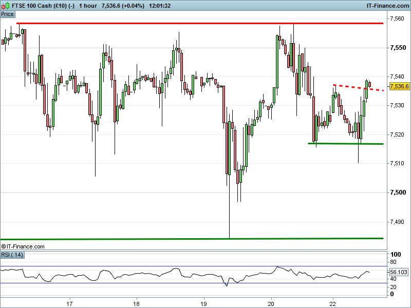 The UK Index 100 is testing the ceiling of a short-term 7515-7535 channel.
