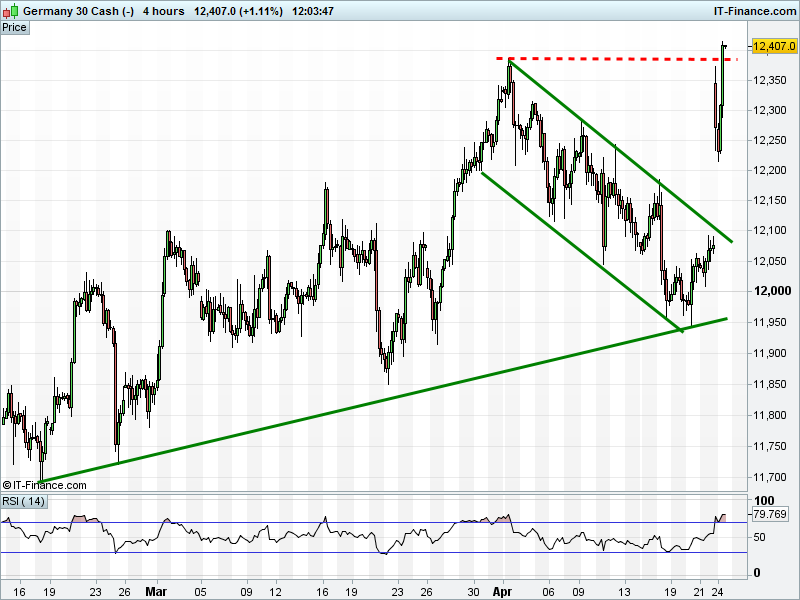 The UK’s UK Index is gaining thanks to Oil majors (oil bounce), Banks (French election), Miners (risk assets) and US exposed markets (CRH, DGE, BATS). German’s DAX is being led by its banks and internationally exposed names.